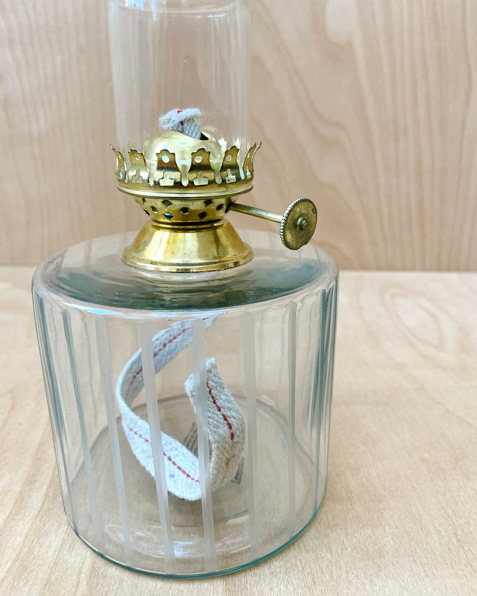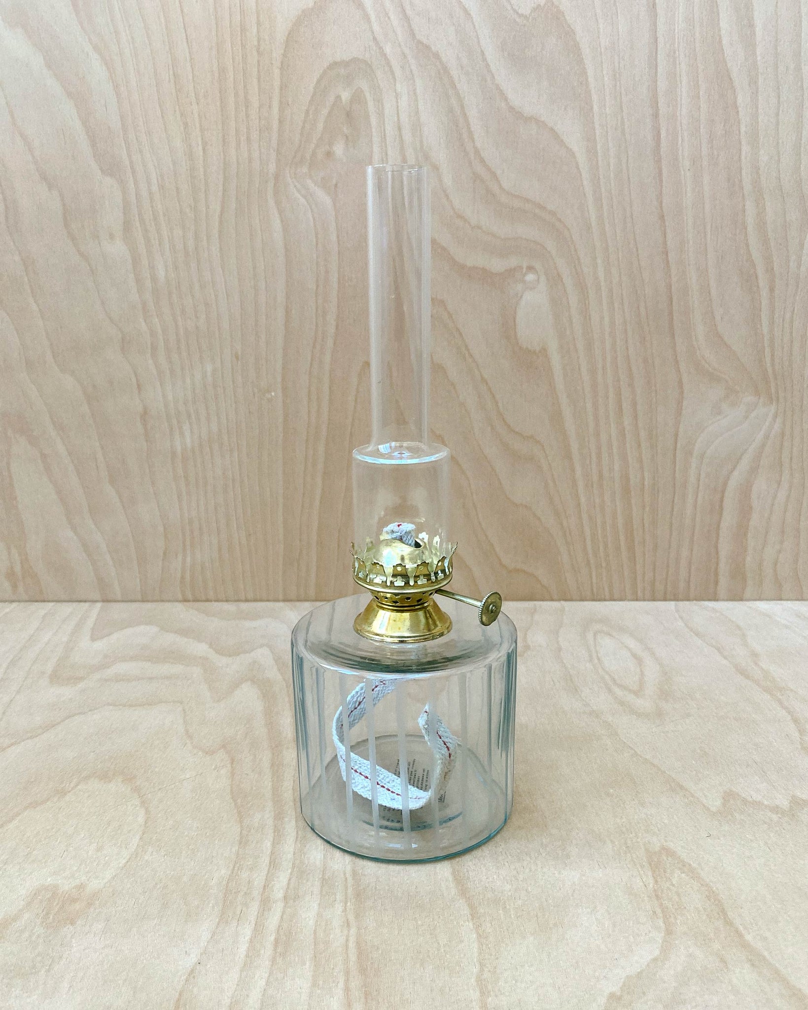 Oil lamp by Swedish design studio Strömshaga. Brass and clear glass with vertically etched lines. Total height 11.8", bottom diameter 3.9". Unused condition.
