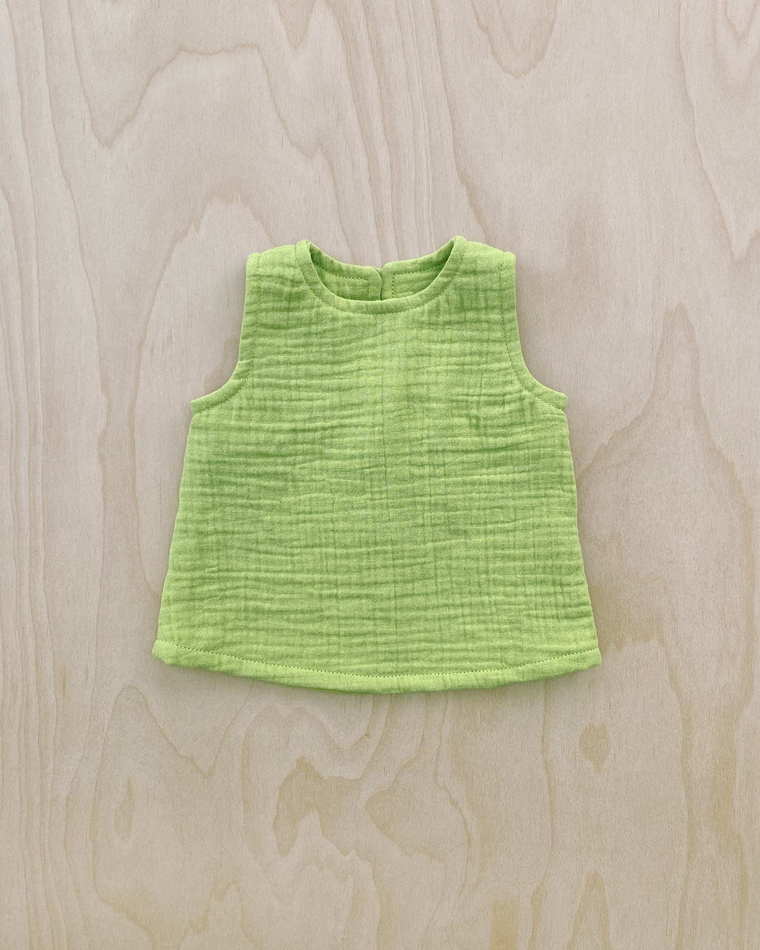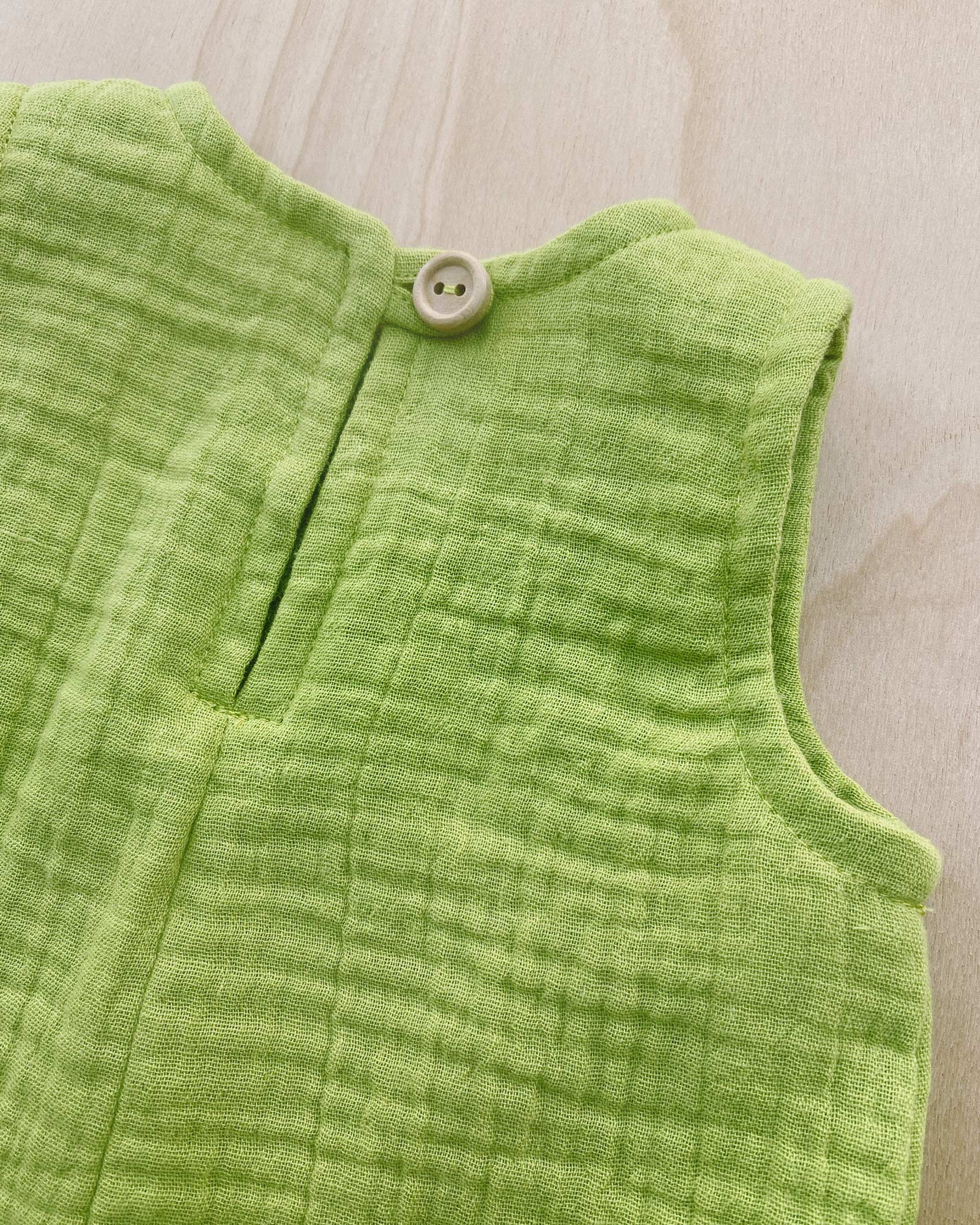 Sleeveless top made from double gauze deadstock fabric in chartreuse. Pre washed, 100% cotton. Wooden button back. Machine wash warm on gentle cycle, hang to dry.