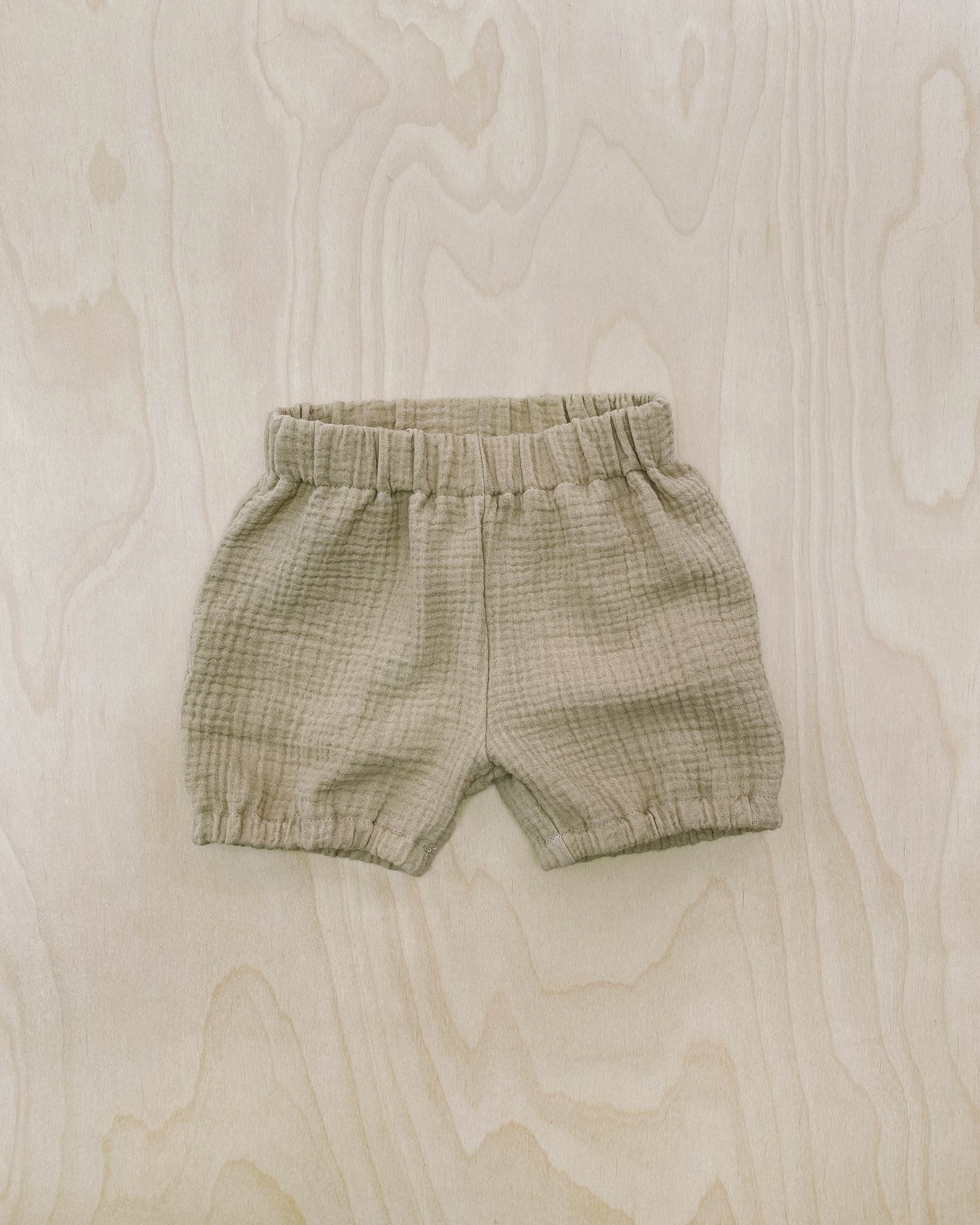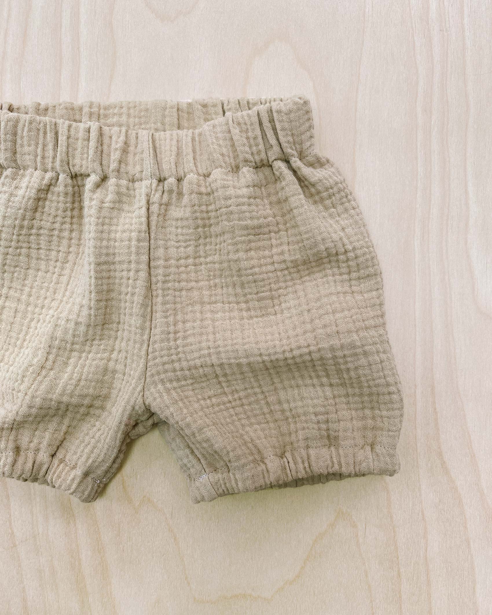Baby bloomer made from double gauze deadstock fabric in sand. Pre washed, 100% cotton. Elastic waist and leg openings. Machine wash warm, dry on gentle cycle.