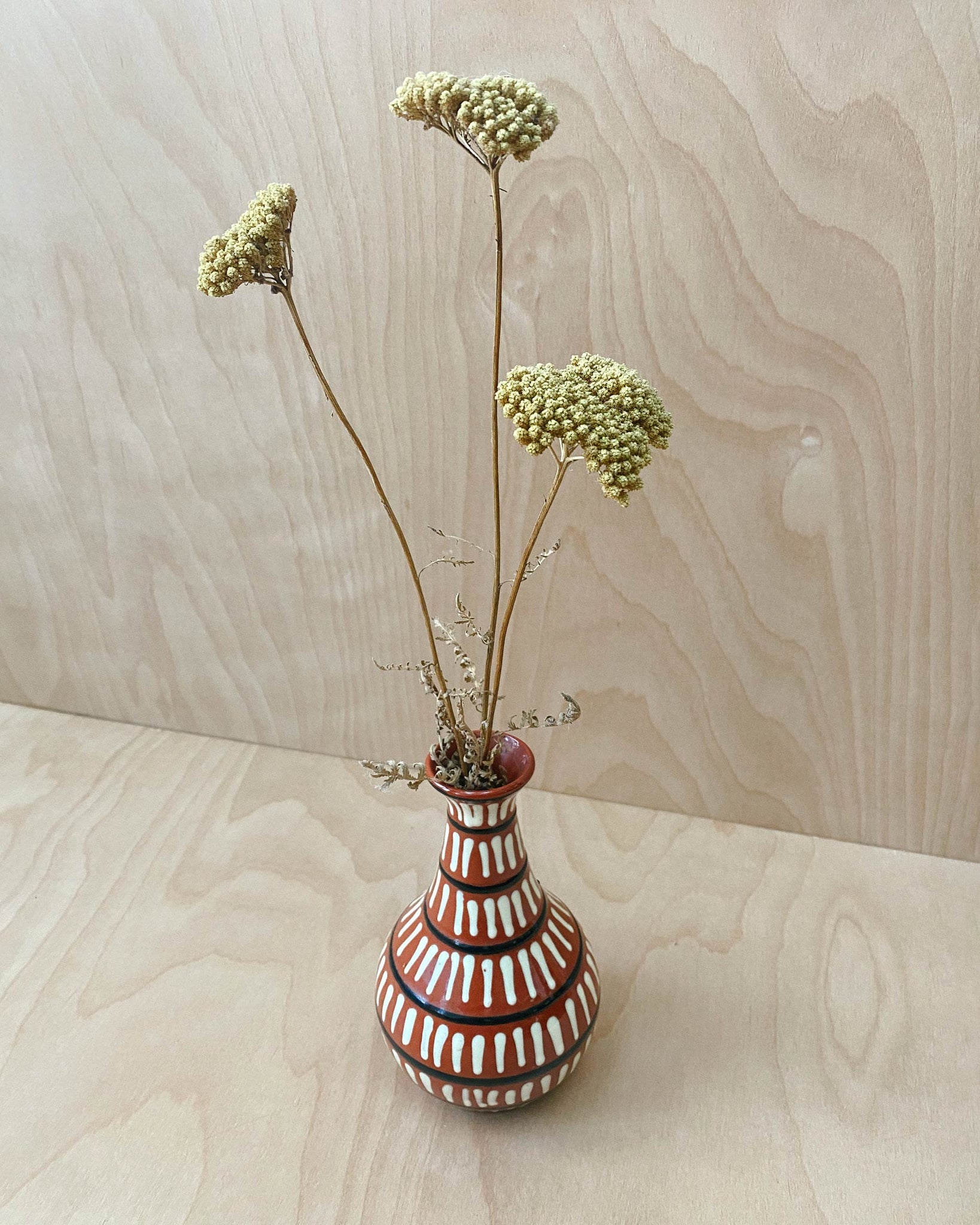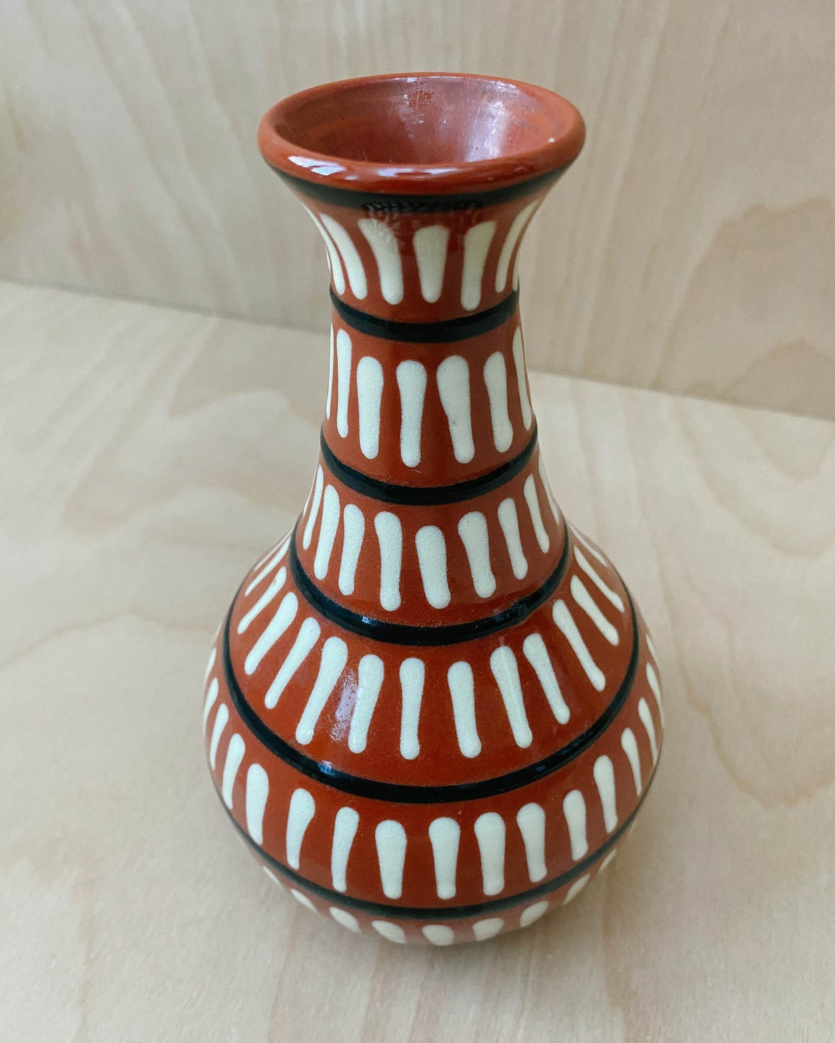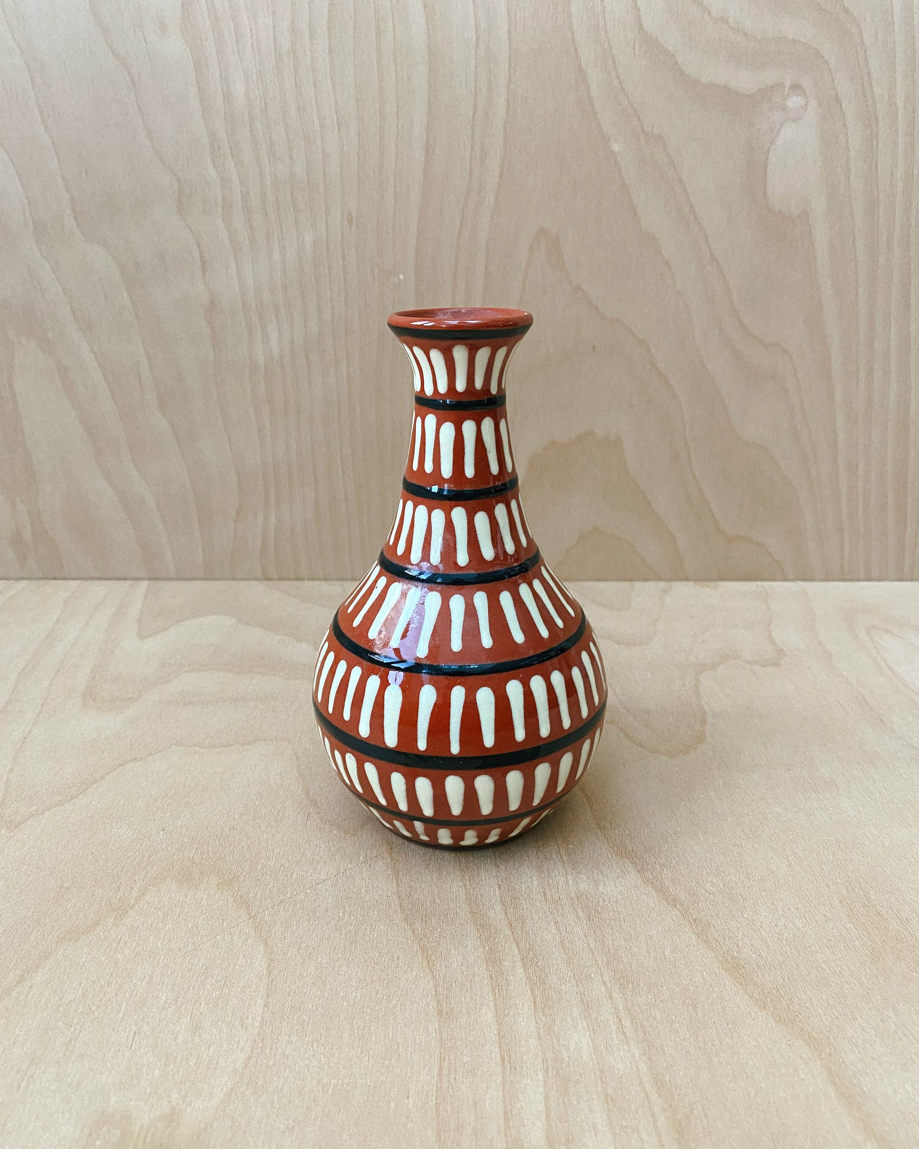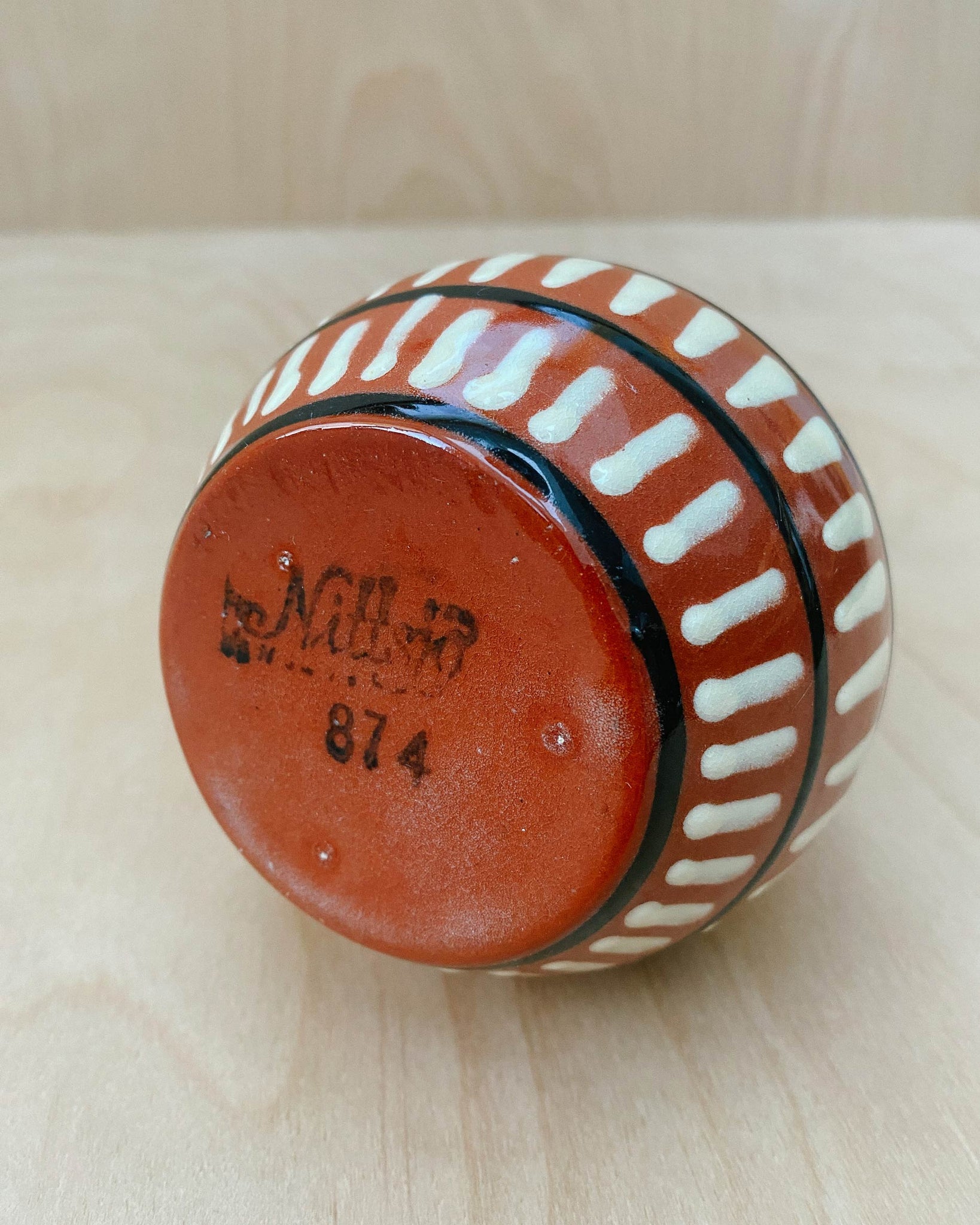 Hand-thrown small ceramic vase from Nittsjö Ceramics. White and black stripes on top of brick red clay with a glossy clear glaze. Bottom stamped Nittsjö Sweden 874. 6.3" tall. In great used condition.