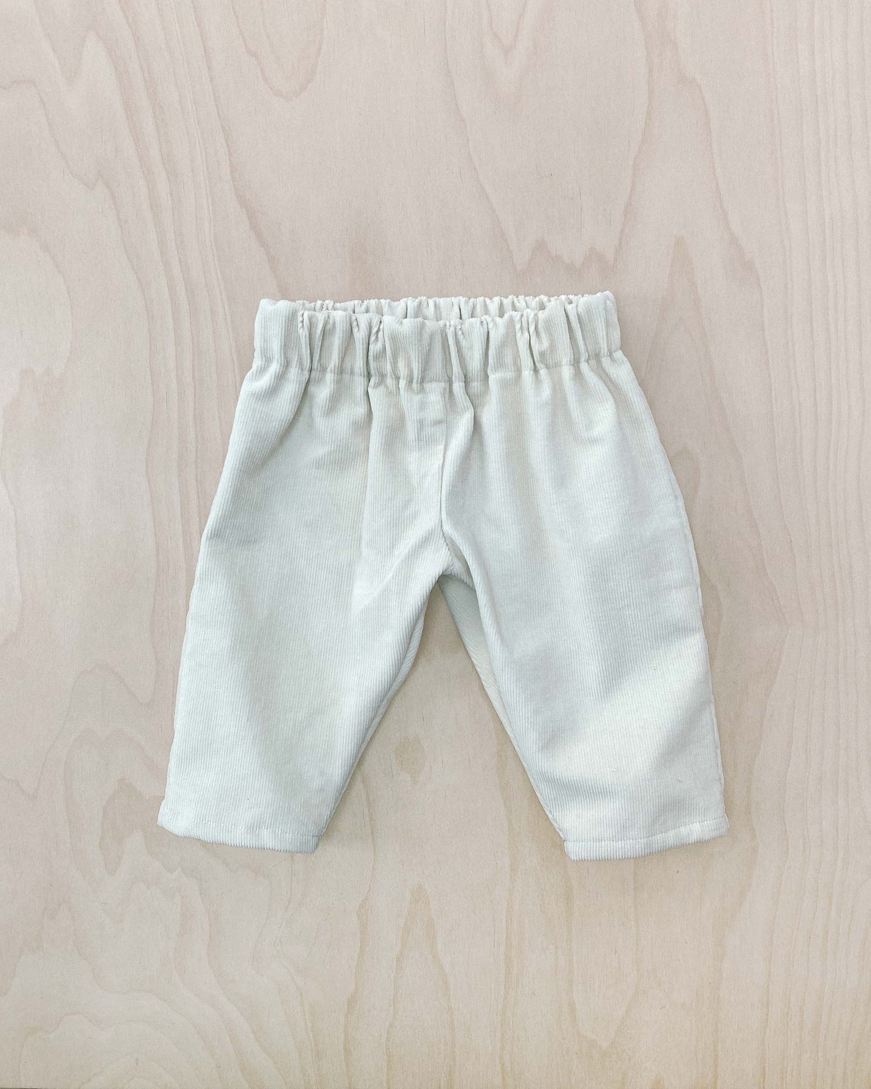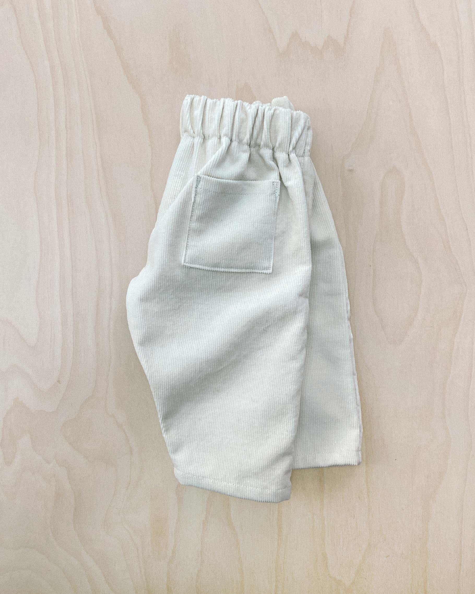 Baby/toddler pants made from white corduroy deadstock. Pre washed, 100% woven cotton. Elastic waist, back pocket.