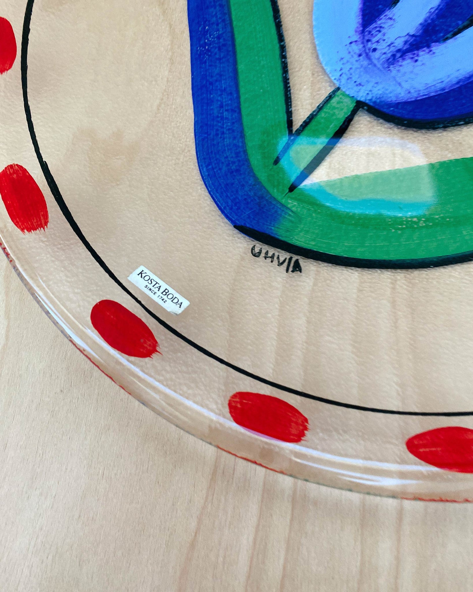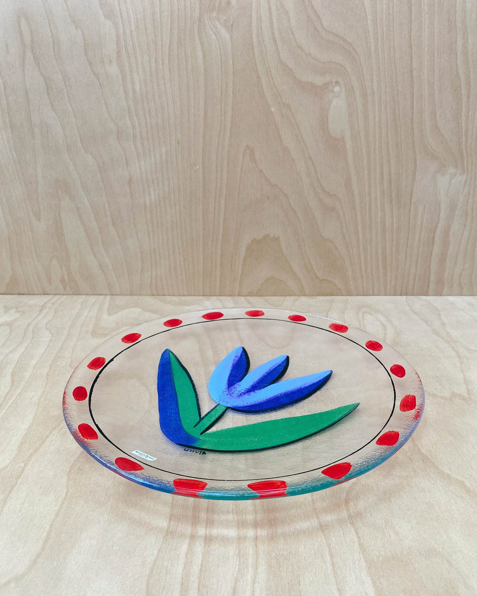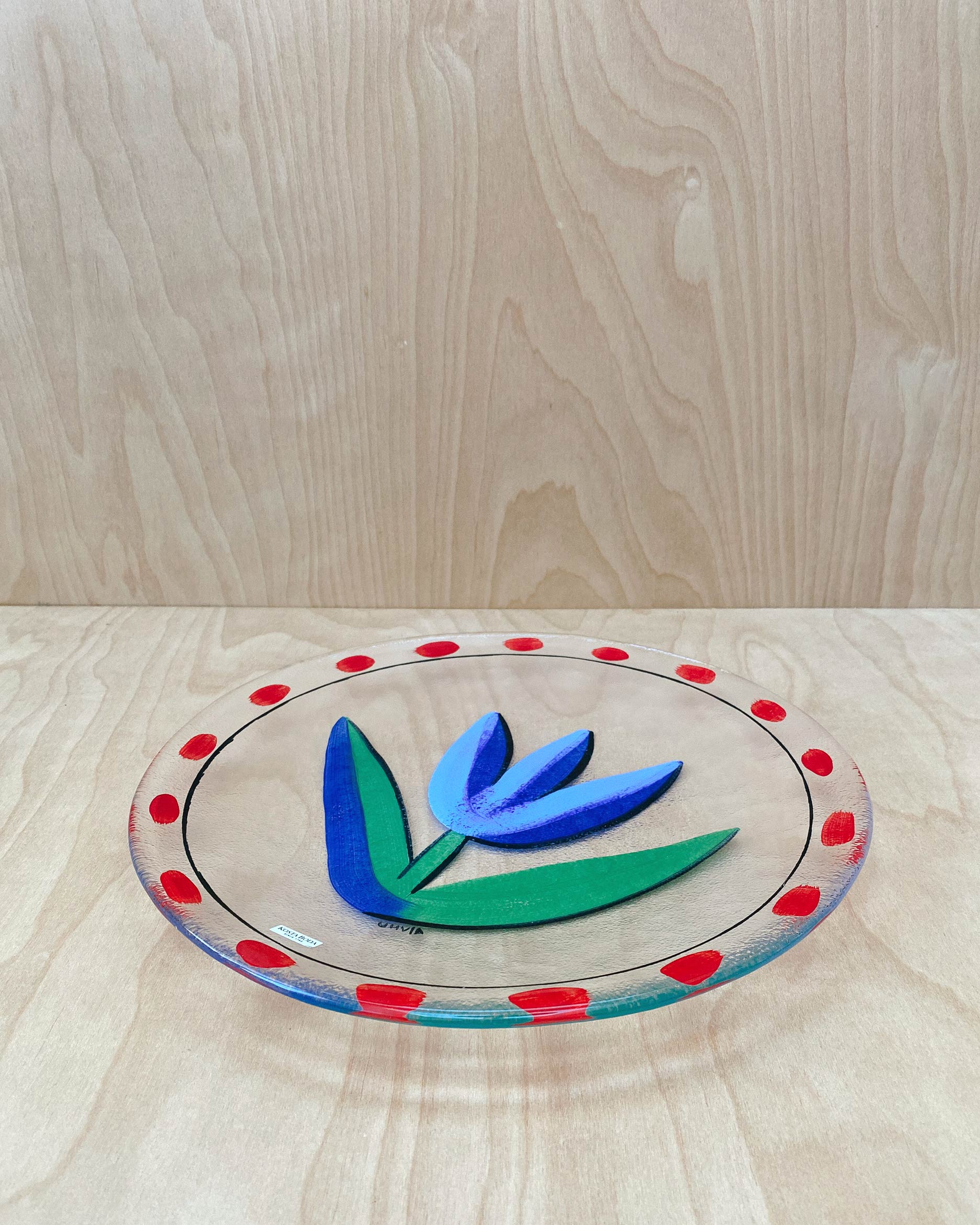 Large vintage glass plate, hand painted by Swedish artist Ulrica Hydman Vallien from the collection Tulipa for Kosta Boda. Diameter 13", in great condition.