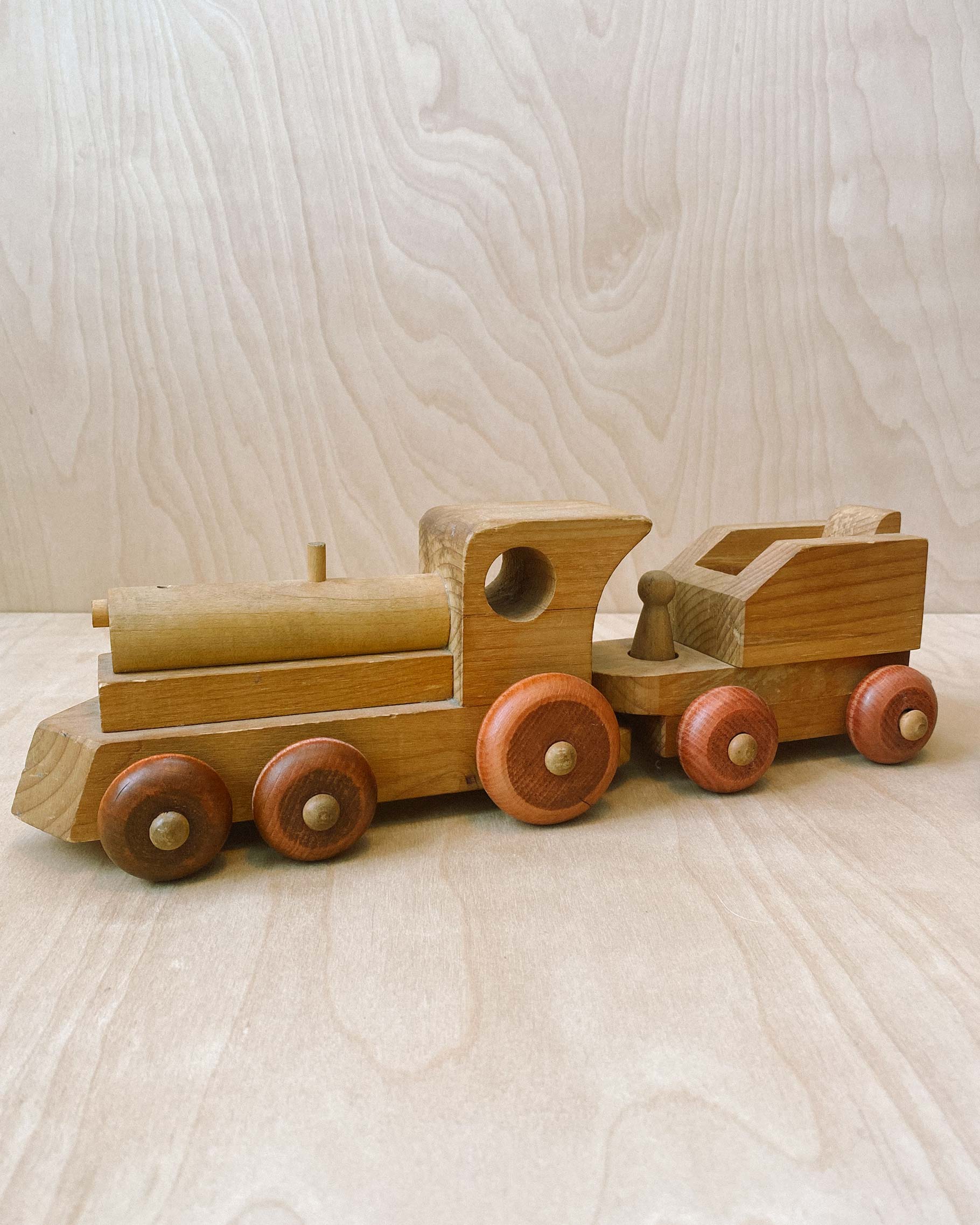 Vintage large wooden train made by The Montgomery Schoolhouse. Includes a locomotive and four train cars. Total length when connected is 33" long, largest train car is 5.5" tall. Shows signs of use but has a lot of play left.